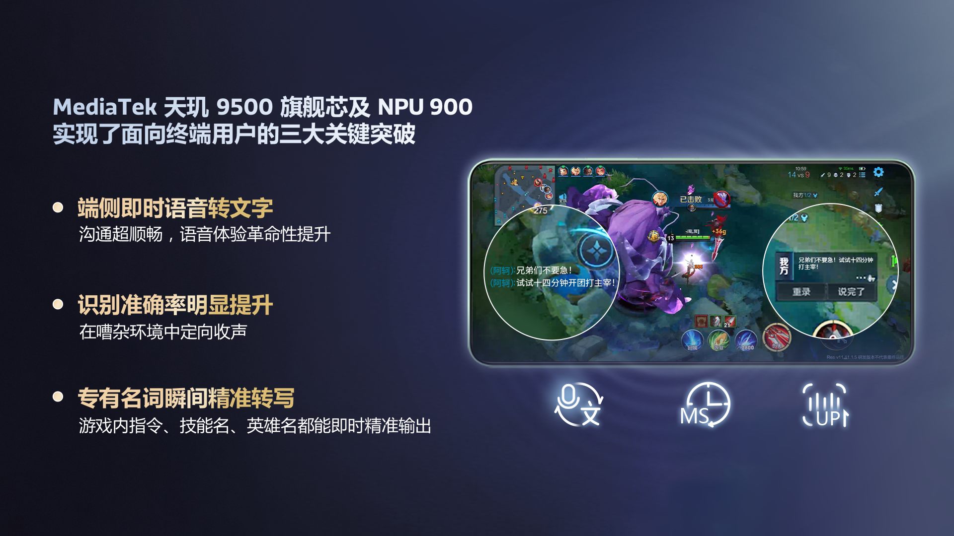 除了软件层面的优化,想要将端侧语音识别真正落地,就离不开硬件设备的支持。因此,MediaTek与《王者荣耀》、腾讯游戏GVoice团队,三方联合基于天玑9500旗舰芯实现了面向游戏用户的三大关键突破: